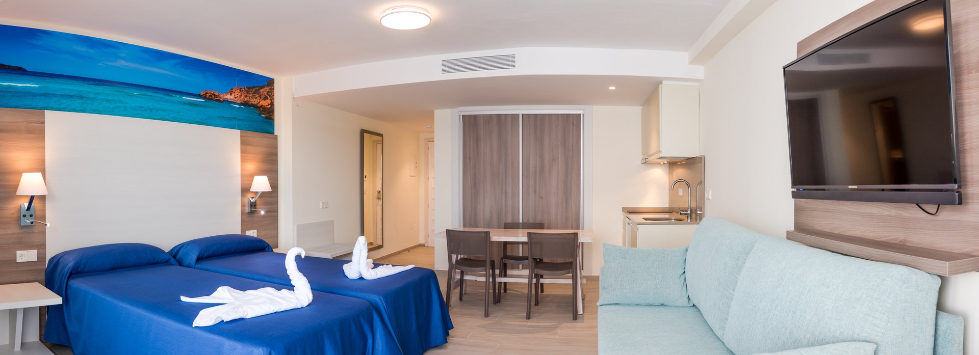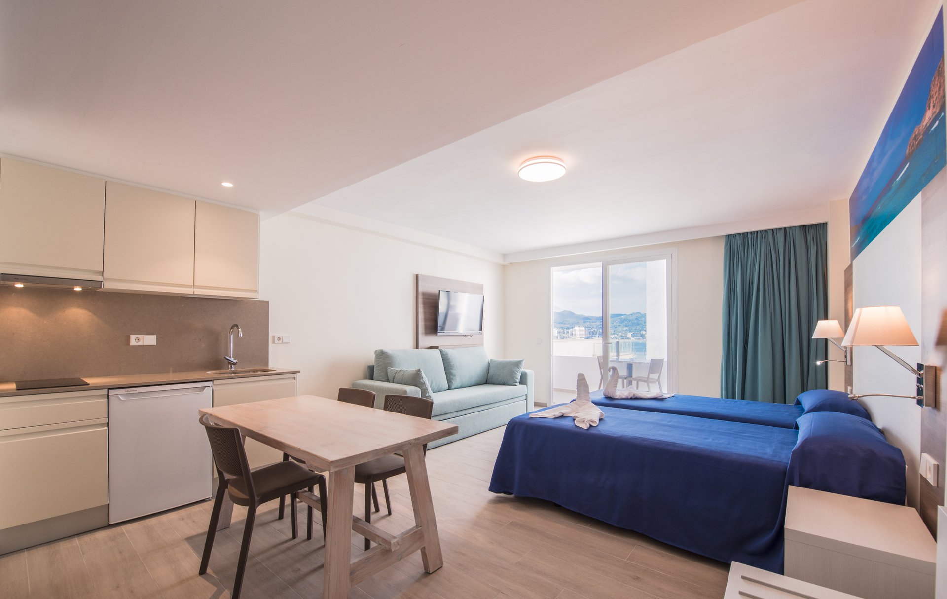 This holiday studio apartment type is fully equipped with a kitchenette, fridge, microwave and basic cleaning equipment. It also has a balcony. It can sleep 2 guests maximum.